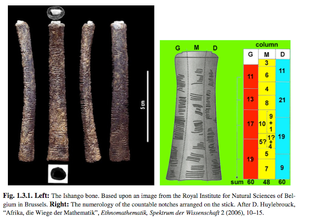 High in the mountains of Central Equatorial Africa, on the borders of Uganda and Zaire, lies Lake Edward, a source of the Nile. It is a small lake (about 30 miles by 60 miles). Though the area is sparsely populated today, approximately 25,000 (update from 9,000) years ago, by the shores of the lake lived a small community that fished, gathered, and grew crops. The settlement only existed a few hundred years before being buried in a volcanic eruption. The place where their remains were found (1960) has a name now given to these people - Ishango. Among their remains is the third oldest mathematical object in Africa.